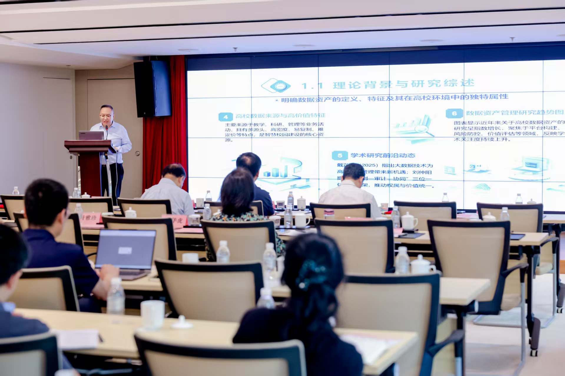 南京中医药大学国有资产管理处处长、江苏省教育会计学会国有资产专委会秘书长祖强在会上作专题交流汇报。祖强处长以《高校数据资产全过程管理的思考与探索——以江苏实践为例》为题,系统分享了江苏省在数据资产管理领域的创新实践。祖强指出,数据资产作为新型生产要素,需纳入国有资产管理体系,通过“盘清家底、建章立制、保障合规、释放价值”等举措,实现从数据资源到数据资产的跃迁。他特别介绍了南京中医药大学作为江苏省首批试点单位的在数据资产管理制度体系建设方面的经验,为与会者提供了可借鉴的管理路径,获得广泛好评。